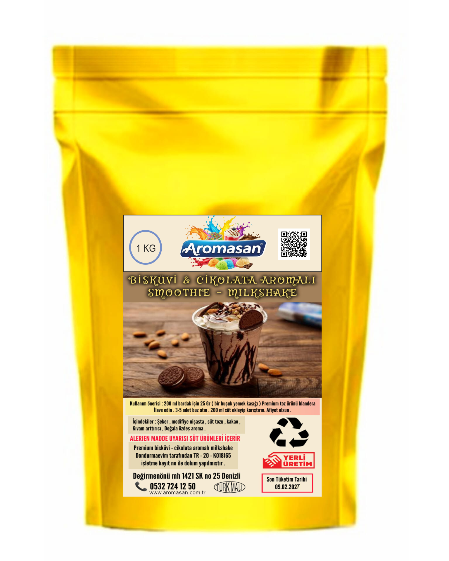 Çikolatalı Bisküvi Aromalı Milkshake Tozu 1 kg, çikolatanın yoğun aroması ile bisküvinin hafif ve lezzetli dokusunu bir araya getiriyor! #ÇikolatalıMilkshake #BisküviMilkshake
